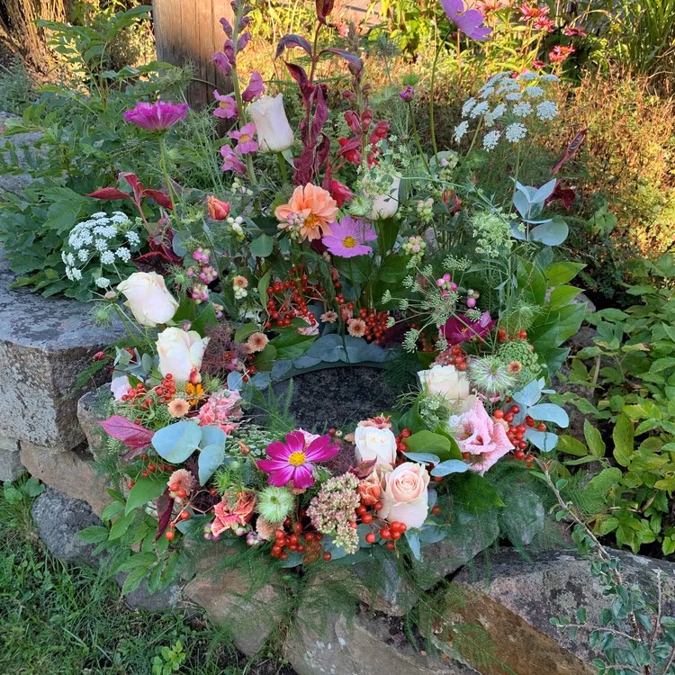 Floristen skapar en dekoration till en urna med känsla av en äng med blandade blomster och färger efter säsong.