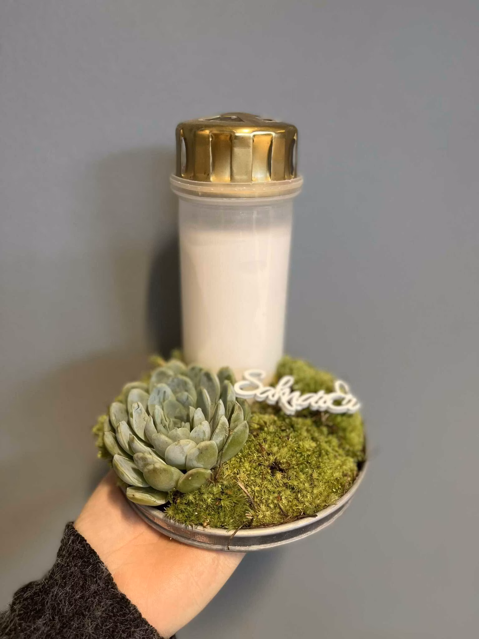 Floristen dekorerar ett fat med gravljus, mossa och taklök.