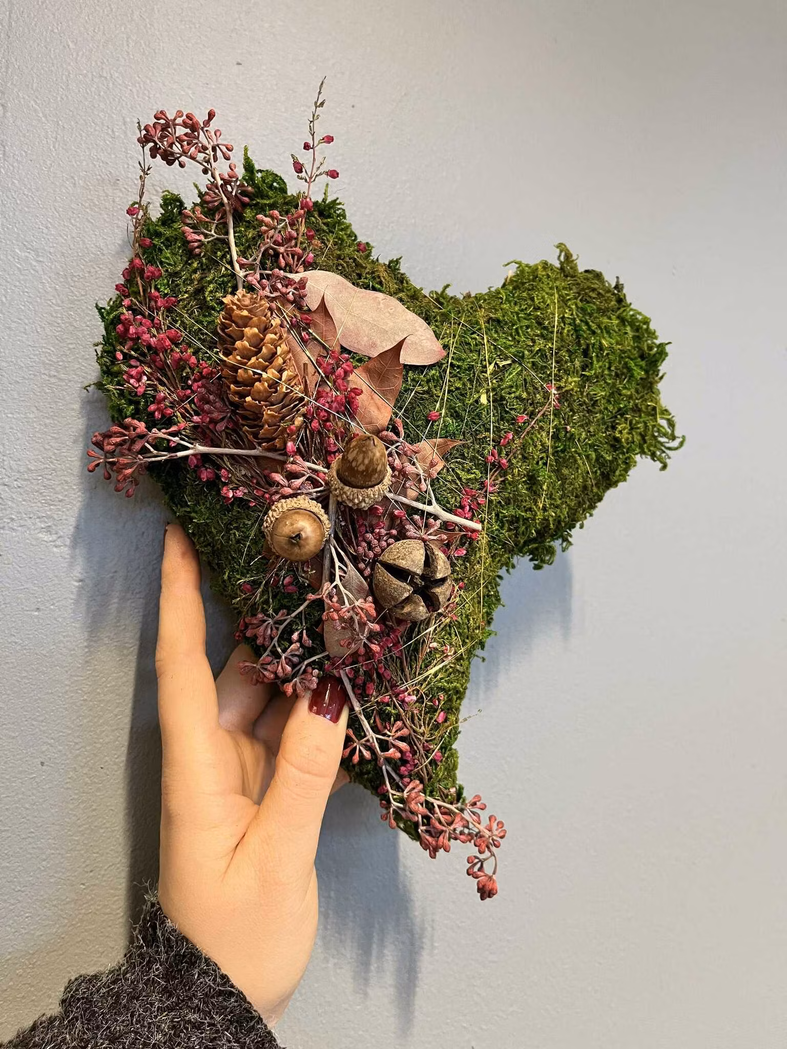 Floristen dekorerar ett mosshjärta av konstmossa. Dekoreras i röda toner