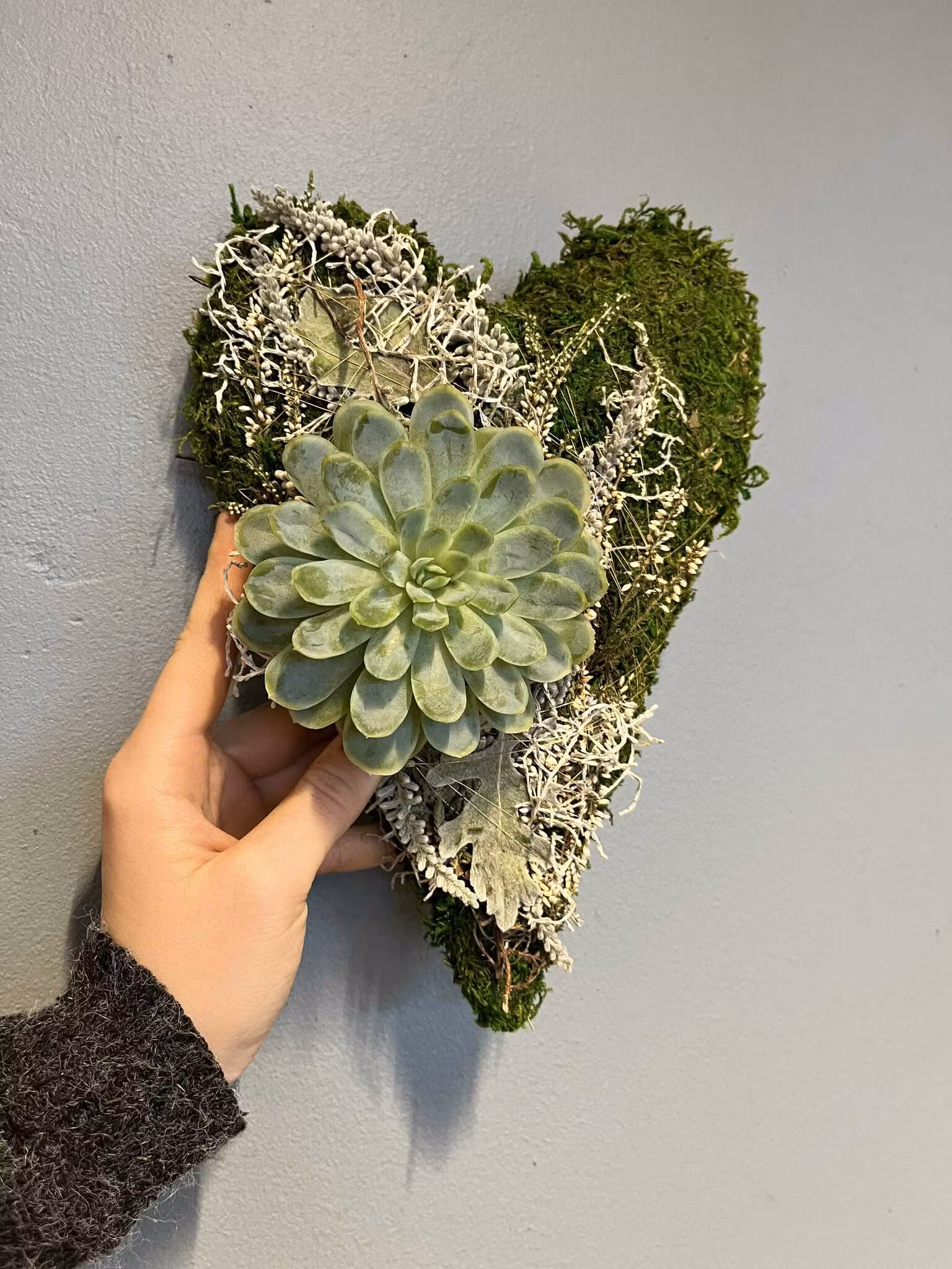 Floristen dekorerar ett Mosshjärta i vitt med taklök.