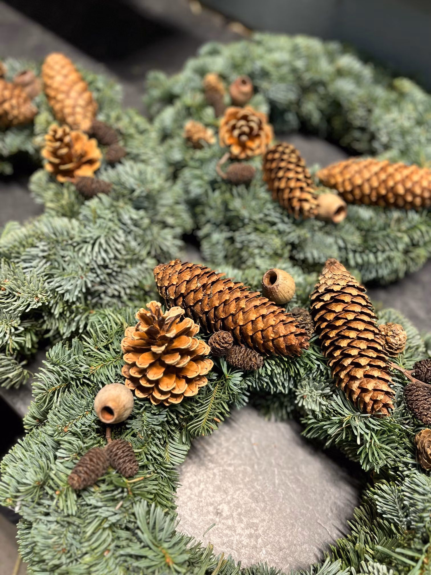 The florist ties a grave wreath with Nobelis as a base and decorates it with various cones. This wreath will last all winter.
