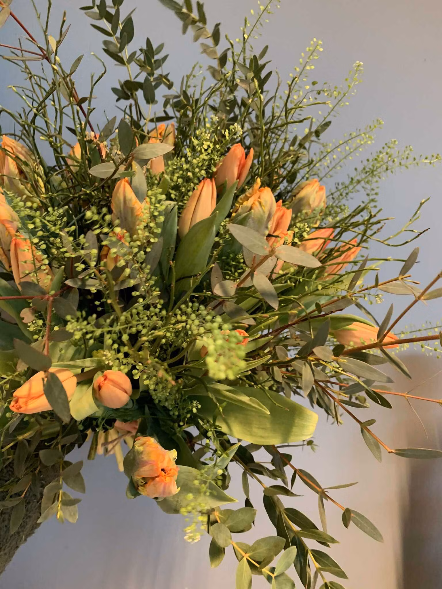 The florist creates a bouquet of tulips in orange combined with matching green.