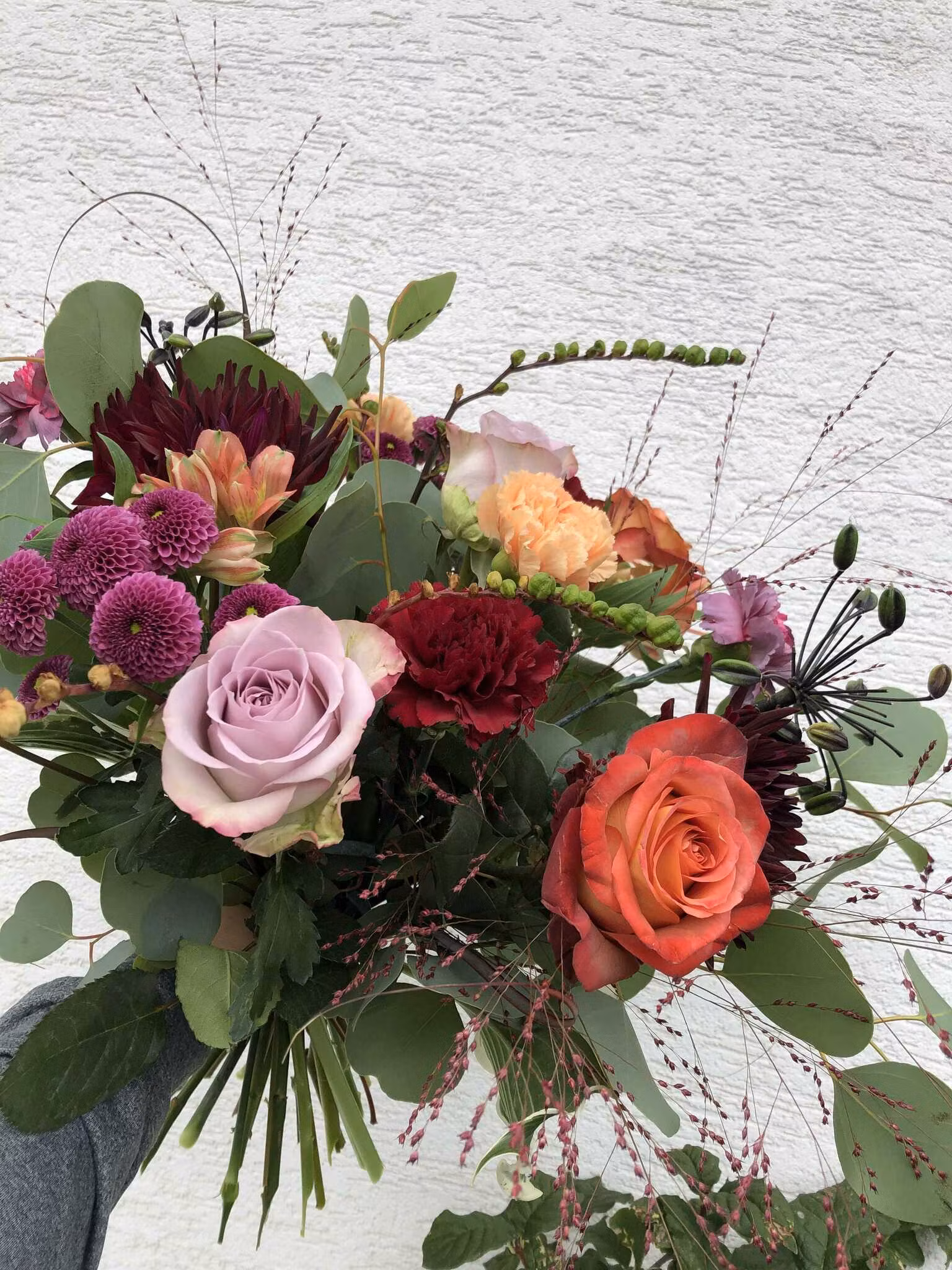 Denna festliga bukett går i glada toner av rött, orange, aprikos och lila i säsongens blommor och grönt.