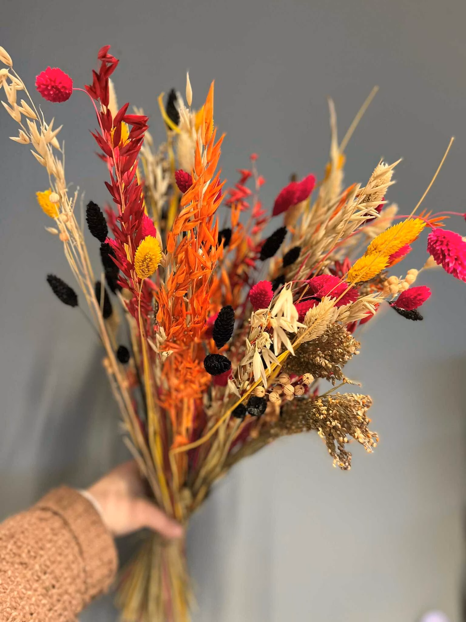 Torkad bukett - Ellen 395.00 SEK Produkten är tyvärr slut i lager. :( Dela Läs mer om denna produkt Recensioner Buketten EllenNatur, gult, rött, cerise och svarta toner i häftig och färgglad mix,Torkat matrialLängre hållbarhetMinimalt underhållModernt