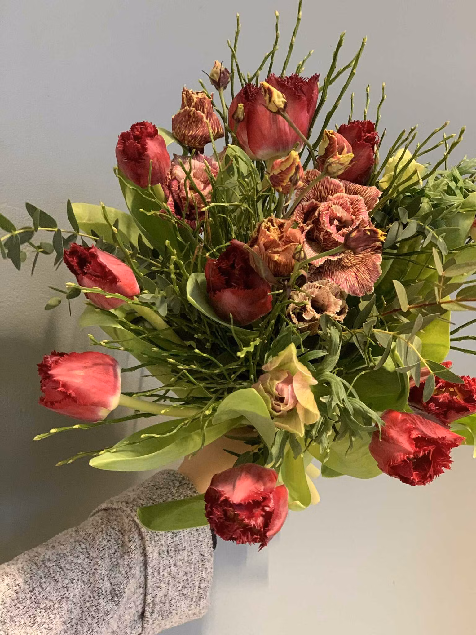 Floristen skapar en bukett med röda tulpaner i en smakfull mix.